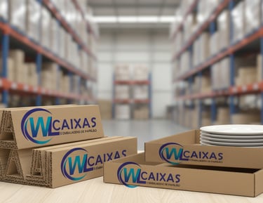 Caixas com divisórias e berços para proteção de produtos delicados.